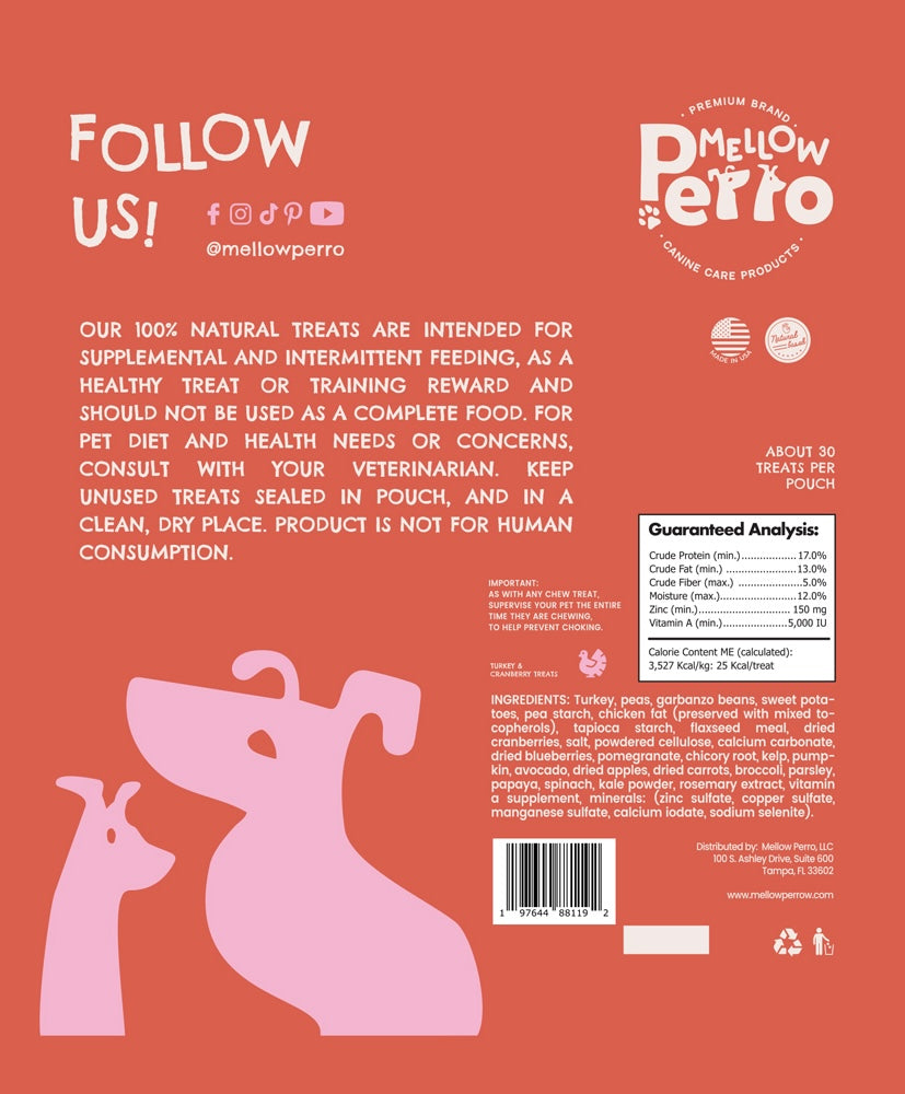 Mellow Perro's Turkey & Cranberry Paw-Print Treats are a healthy, made-in-America snack for your dog. Each 8 oz pouch contains delicious, wholesome ingredients that will leave your pet begging for more. You can feel good about giving them these treats because they are free of artificial preservatives, flavors, and colors.