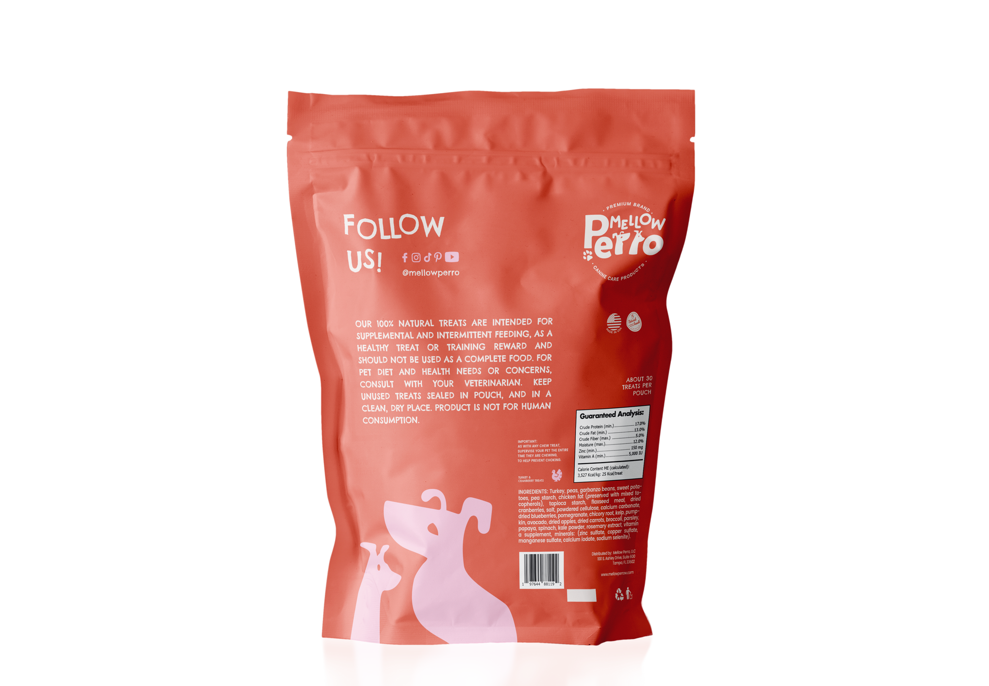 Dietary Fiber: Garbanzo beans and sweet potatoes contribute to digestive health, supporting regularity and optimal nutrient absorption. Give your dog a treat you can trust with Mellow Perro's Turkey and Cranberry Paw-Print Treats!